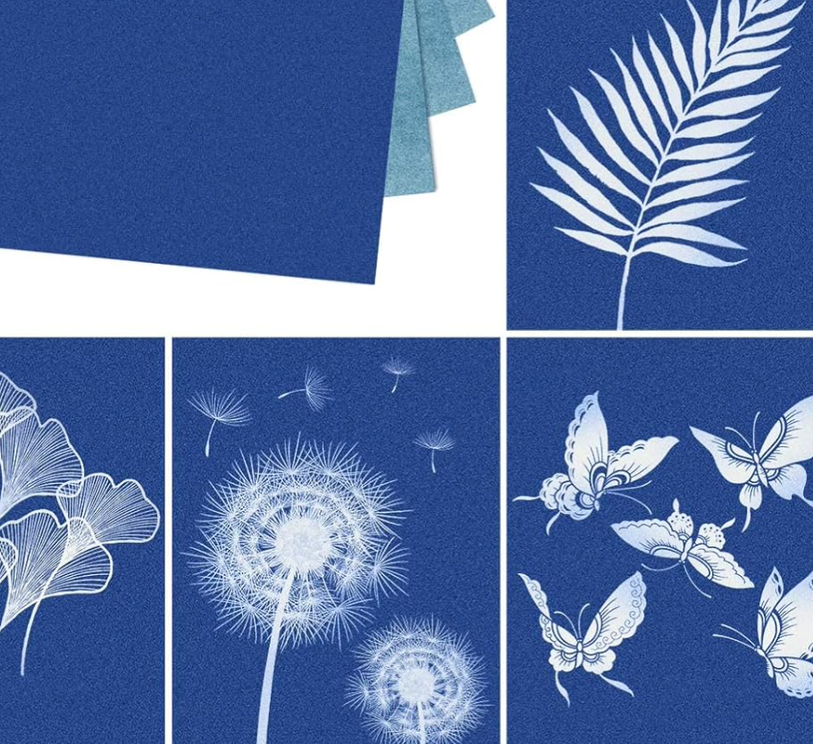 Sunprint is one of the most popular cyanotype kits on Amazon, especially for beginners and classrooms. This kit uses pre-treated paper squares, making it incredibly easy — just arrange objects, expose to sunlight, rinse, and enjoy.