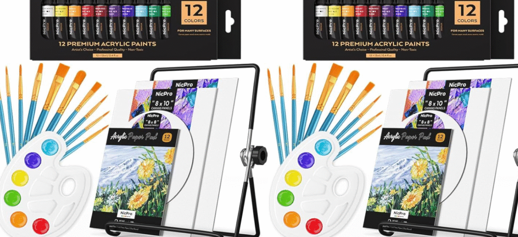 Nicpro consistently ranks as a top Amazon seller for paint party supplies. This kit includes mini canvases, acrylic paints, brushes, palettes, and accessories — making it ideal for hosting paint nights with zero prep.
